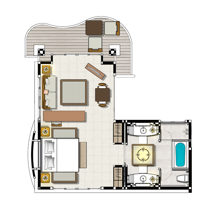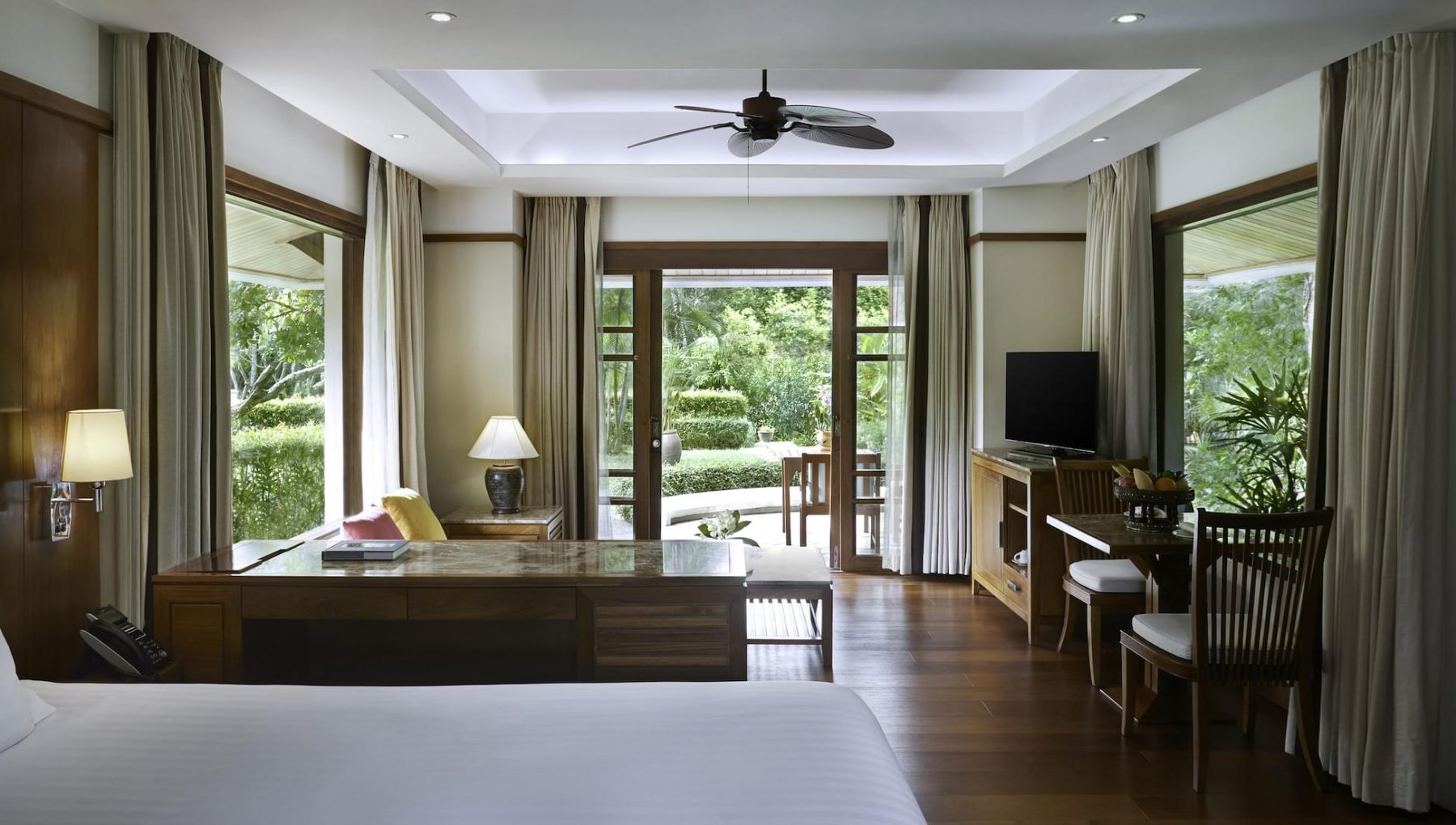 Hidden within the lush gardens, these private sanctuaries are blessed with a blissfully secluded ambience. Surrounded by colourful tropical plants and connected by winding pathways, each Deluxe Garden Villa features an open-plan design with wooden floors and furniture and elegant Thai décor, including bright silks that add splashes of colour.