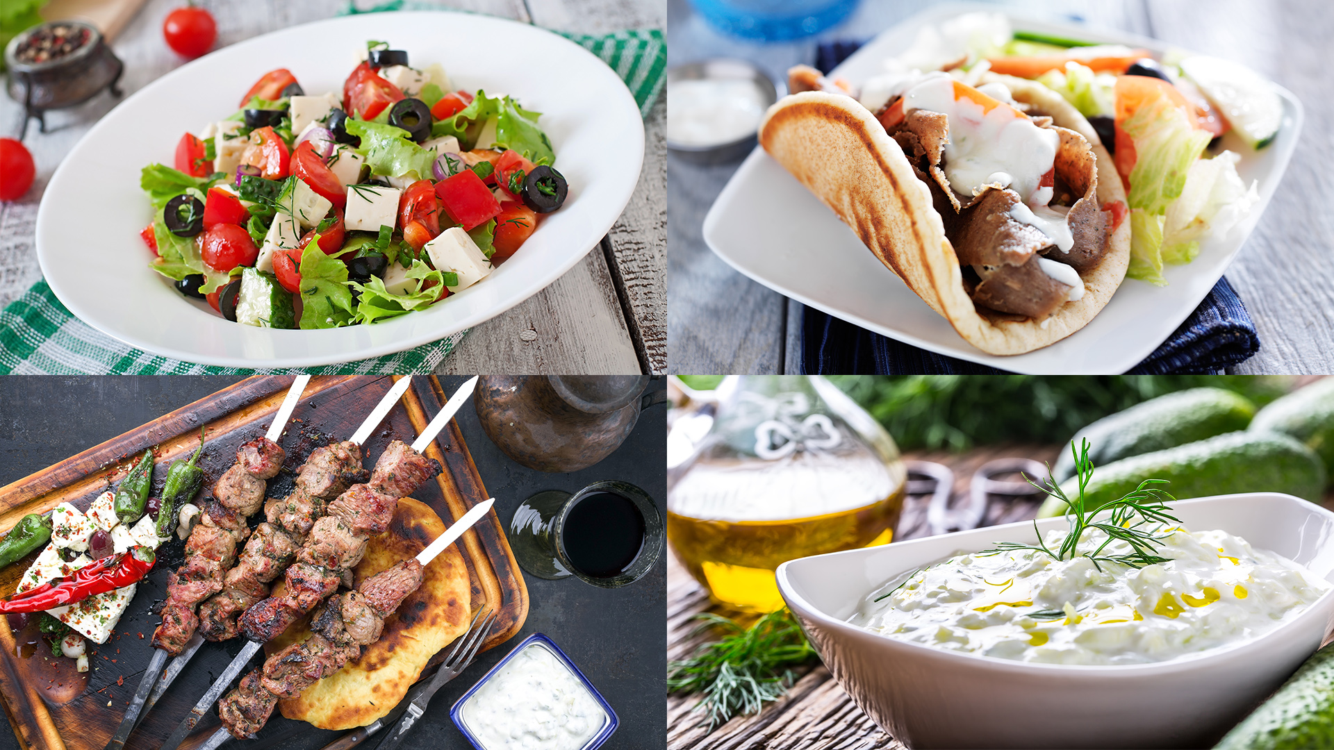 Tzatziki – eine Allzwecksoße in der griechischen Küche. Sie wird aus einer Kombination von griechischem Joghurt, Knoblauch, Zitrone und Dill hergestellt, dann mit Olivenöl beträufelt und mit einigen Oliven garniert. Oft als Partydip neben Salaten oder Kebabs gegessen.